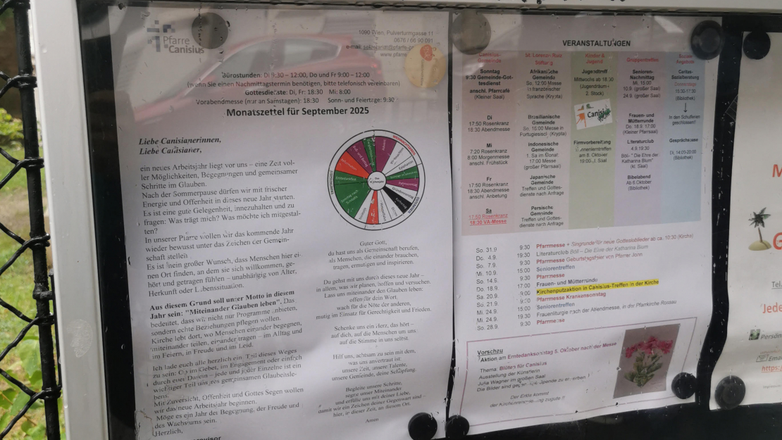 On 1 September 2025, multiple instances of graffiti were discovered on the public announcement boxes outside Canisiuskirche, located at Lustkandlgasse 36 in Vienna’s 1090 district. The markings included the word “Kefir,” a derogatory term for non-believers in Arabic.