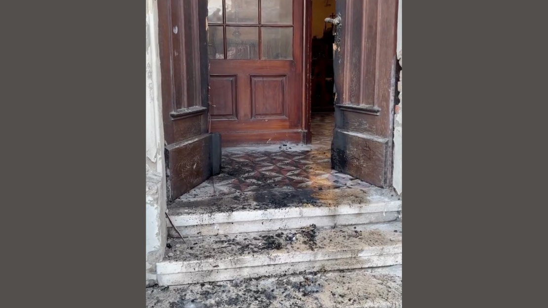 Unknown individuals set fire to a side entrance of the Church of the Name of Mary, damaging a 19th-century door. No injuries were reported.