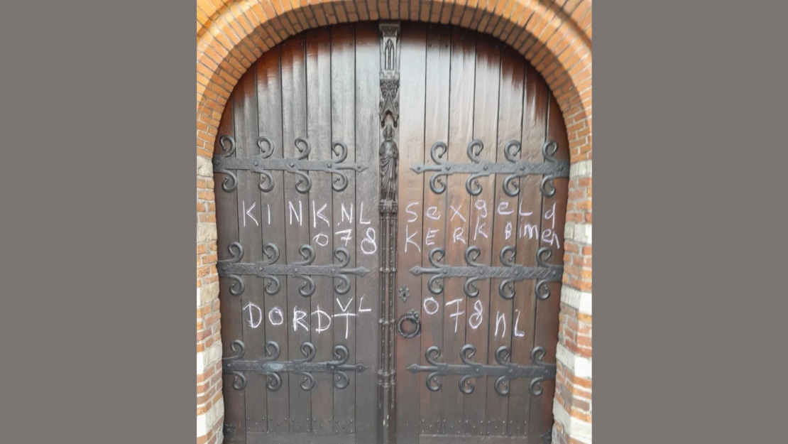 Sexually explicit messages were written on two doors of the church. In addition, cigarette butts and sanitary products were deliberately left on the main altar. A further degrading act involved placing underwear over the head of a statue of a saint.