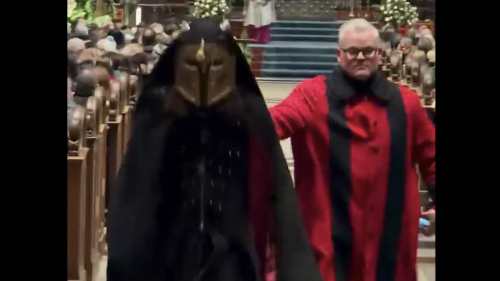 A masked man in a black cloak, gold mask, and plush ears disrupted the Christmas Vespers and approached the front of Cologne Cathedral before being escorted out by church security.