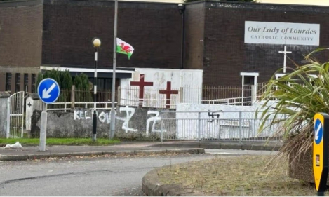 Swastika and Russian “Z” symbols were graffitied on Our Lady of Lourdes church in Swansea, prompting police investigation and condemnation from civic and religious leaders.