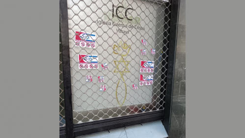Unknown individuals placed offensive stickers on the entrance of the Evangelical Church of Cuerpo de Cristo in Sestao, Vizcaya, displaying anti-Semitic messages and a swastika. The vandals also targeted the church's emblem, which contained Jewish symbols.